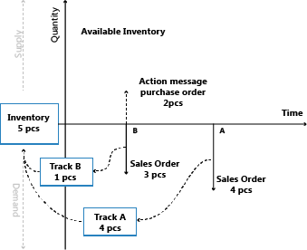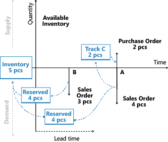 For example, if the user enters or changes a sales order, the dynamic order tracking system will instantly and search for an appropriate supply to cover the demand. This could be from inventory or from an expected supply order (such as a purchase order or a production order). When a supply source is found, the system creates a link between the demand and the supply, and displays it in view-only windows that are accessed from the involved document lines. When appropriate supply cannot be found, the dynamic order tracking system creates action messages in the planning worksheet with supply plan suggestions reflecting the dynamic balancing. Accordingly, the dynamic order tracking system offers a very basic planning system that can be of help both to the planner and other roles in the internal supply chain.