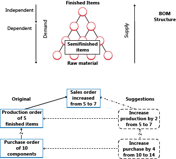 In a manufacturing environment, the demand for a finished, sellable item will result in derived demand for components that comprise the finished item. The bill-of-material structure controls the component structure and can cover several levels of semi-finished items. Planning an item at one level will cause derived demand for components at the next level, and so on. Eventually, this will result in derived demand for purchased items. Consequently, the planning system plans for items in order of their ranking in the total BOM hierarchy, starting with finished saleable items at the top level and continuing down through the product structure to the lower level items (according to the low-level code).