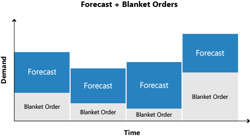 Forecasts and blanket orders both represent anticipated demand. The blanket order, which covers a customer’s intended purchases over a specific period of time, acts to lessen the uncertainty of the overall forecast. The blanket order is a customer-specific forecast on top of the unspecified forecast as illustrated below.