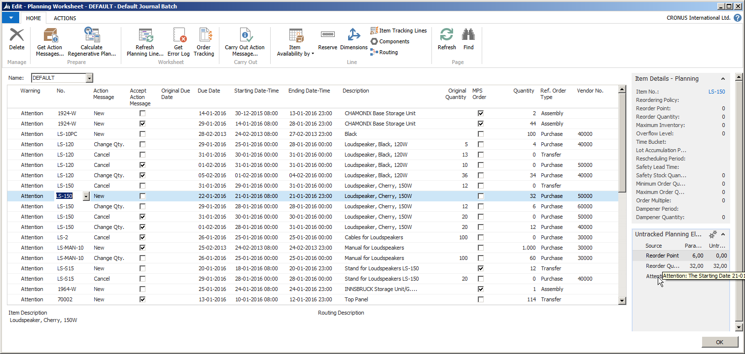 If an item’s inventory is negative on the planning starting date, the planning system suggests an emergency supply for the negative quantity to arrive on the planning starting date. The warning text states the starting date and the quantity of the emergency order. For more information, see Design Details: Handling Projected Negative Inventory.